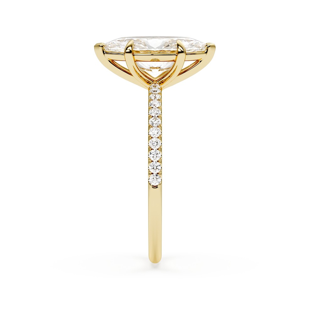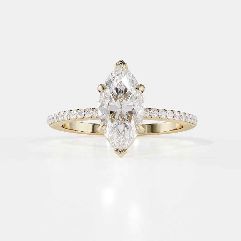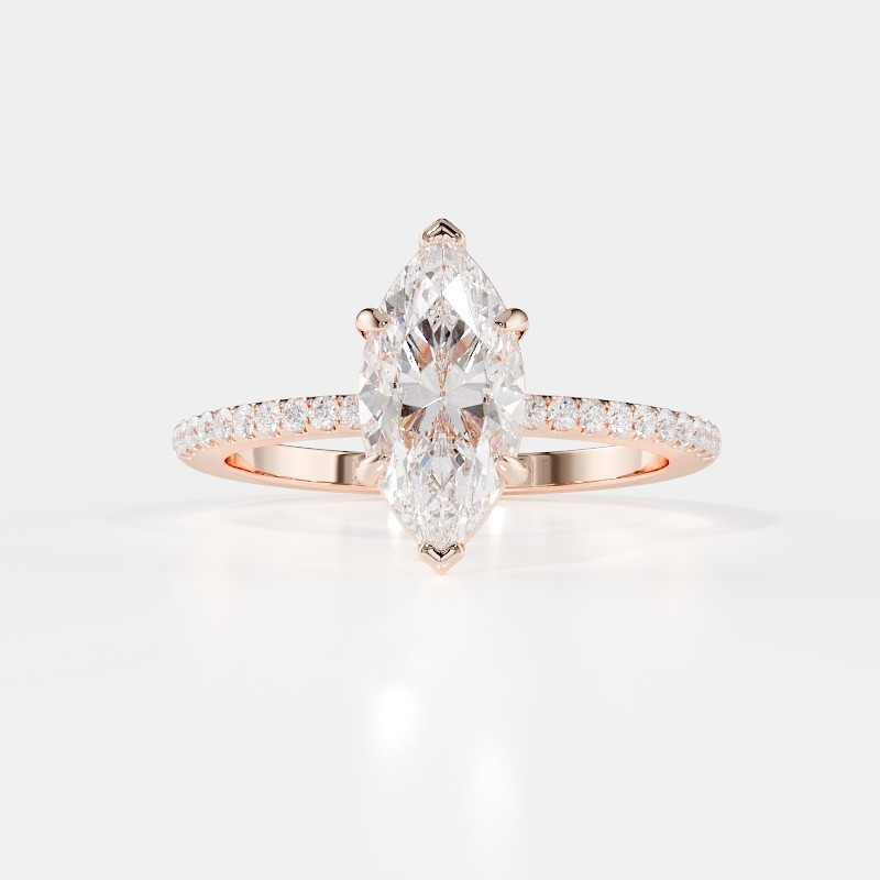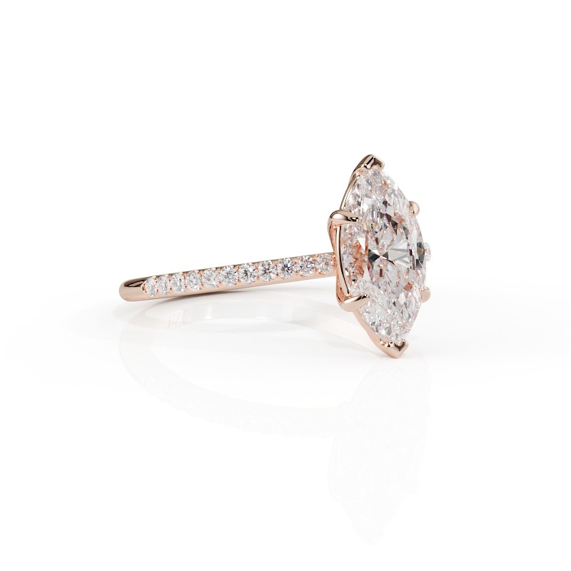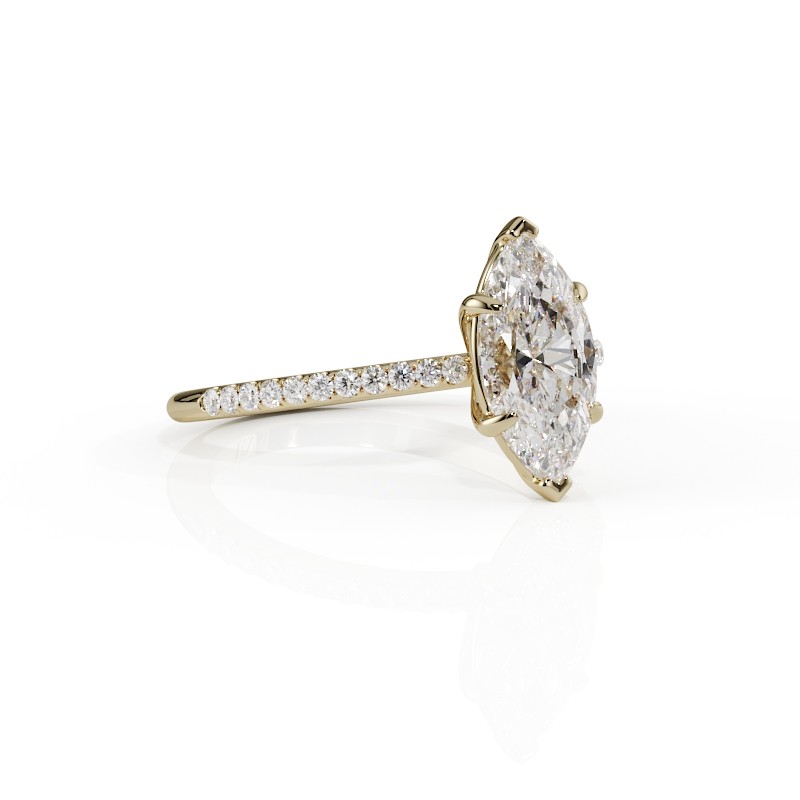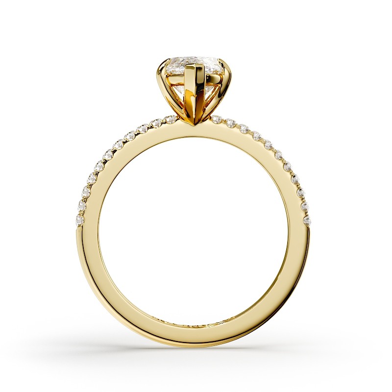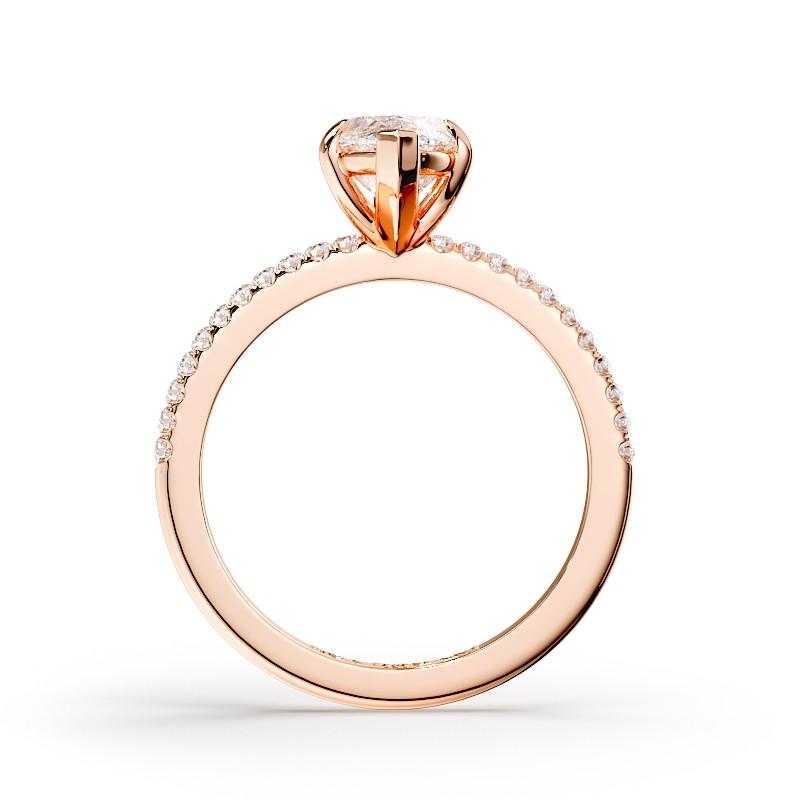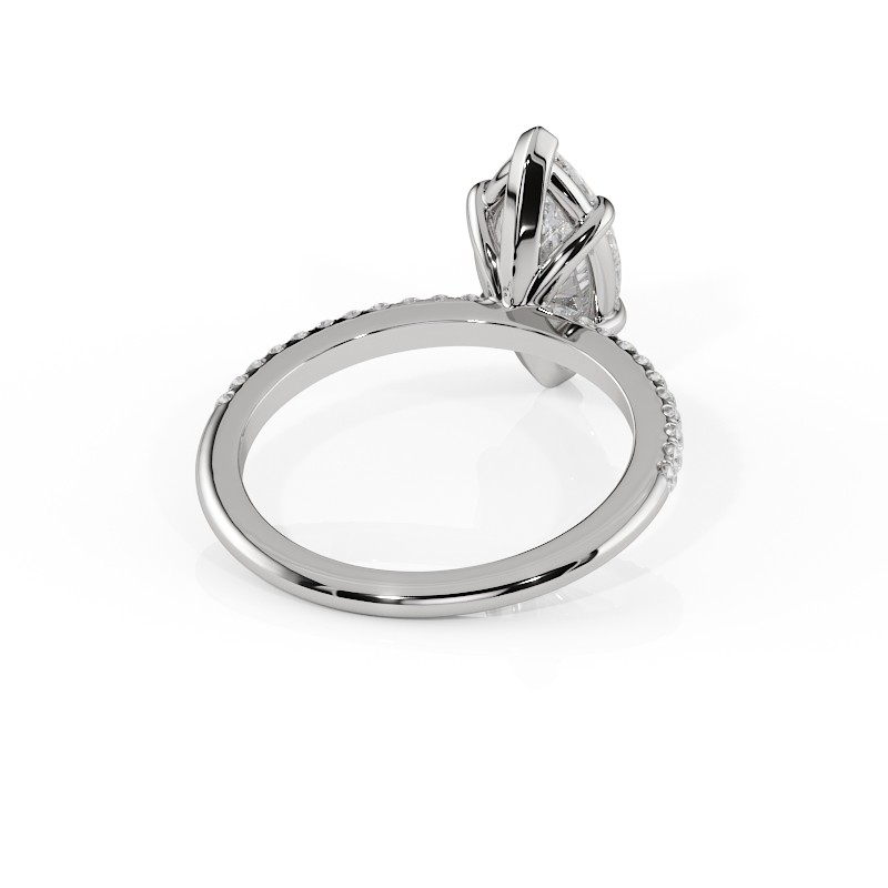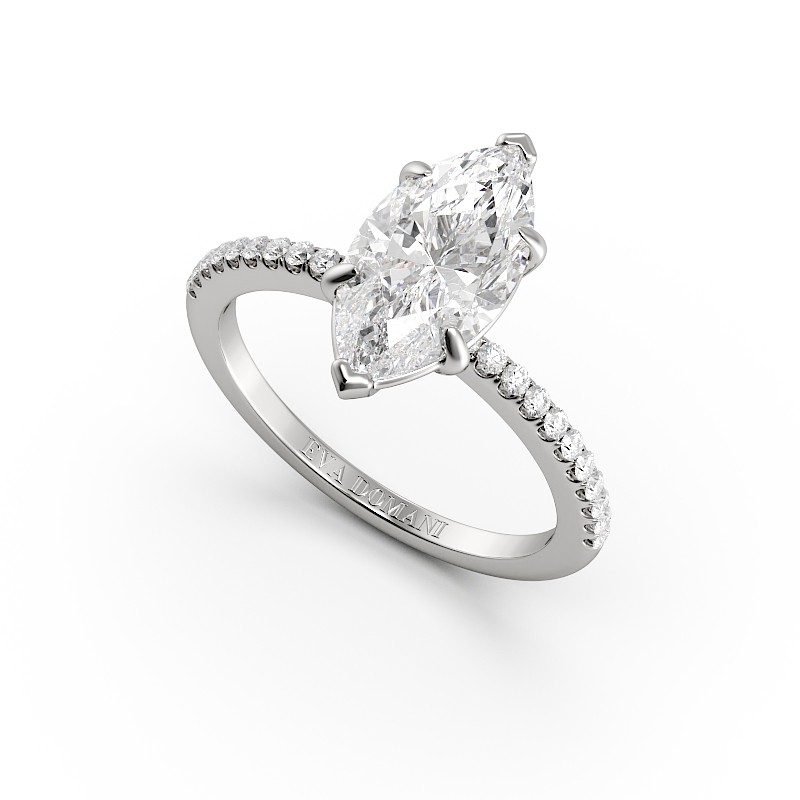 La monture se distingue par ses lignes aériennes et son design légèrement enveloppant, qui accompagne la pierre avec délicatesse. Un pavage fin vient souligner l’ensemble, renforçant l’éclat du diamant sans jamais l’alourdir. Chaque détail est travaillé pour offrir une bague élégante, contemporaine et intemporelle.