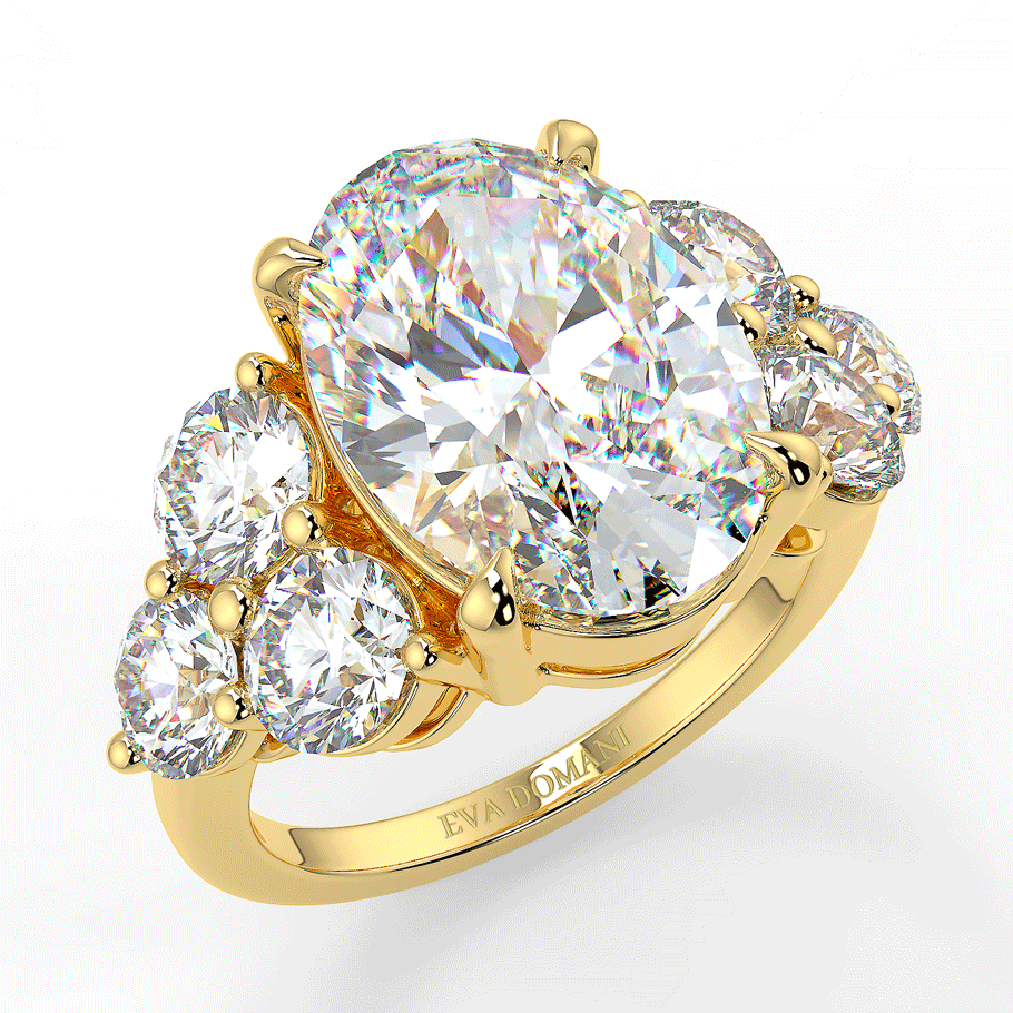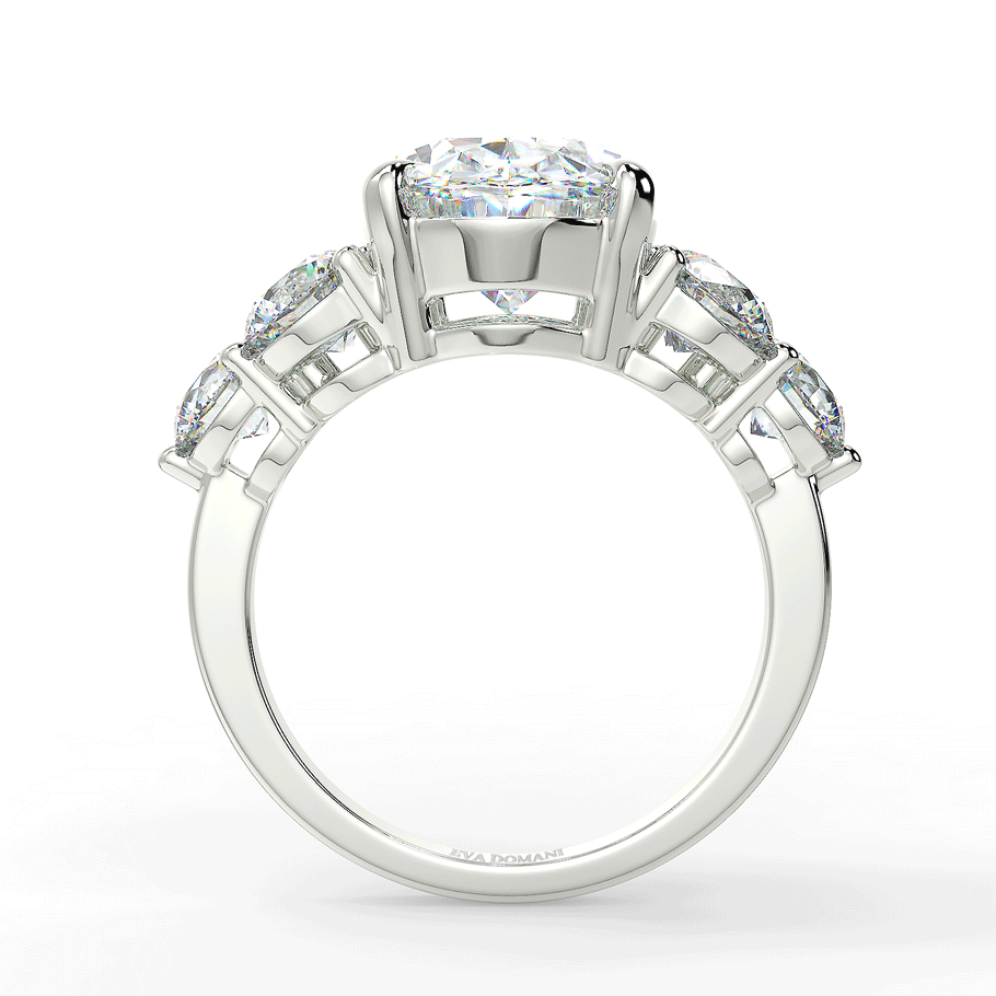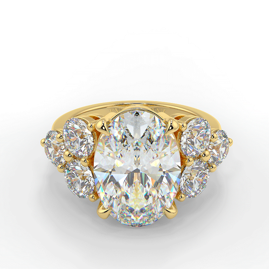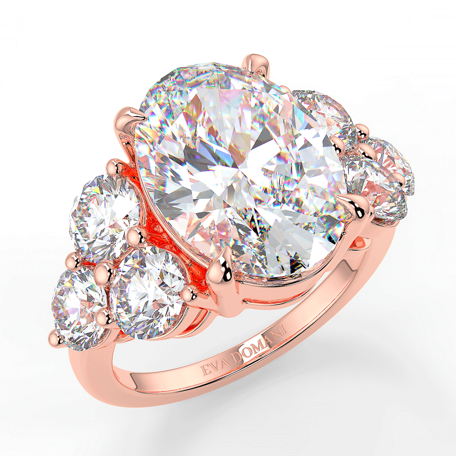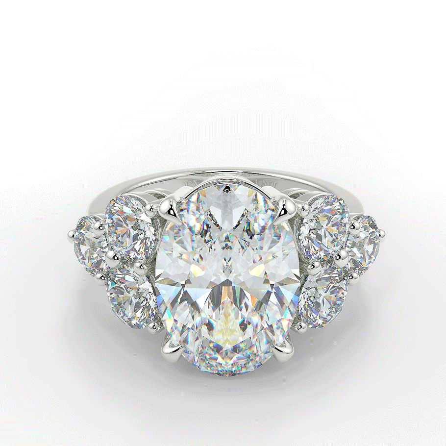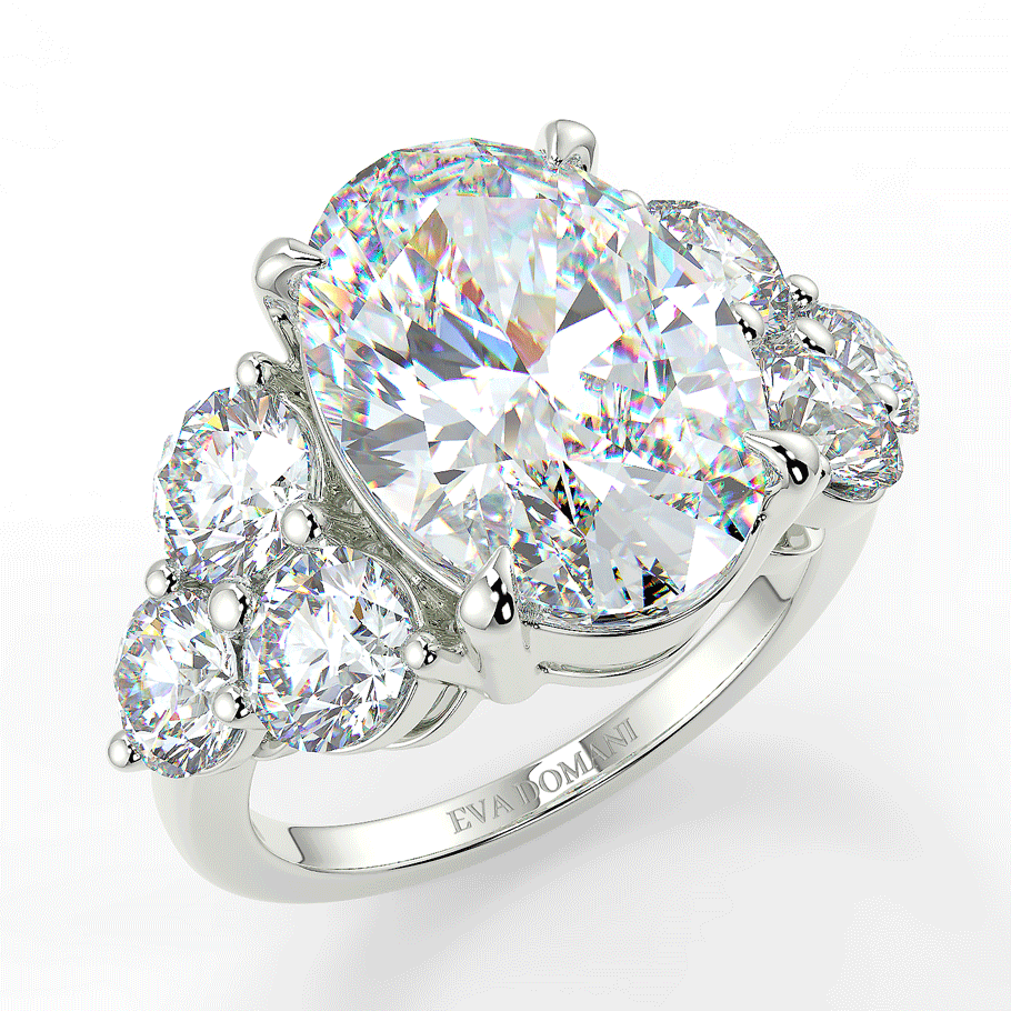 Diamètre des Diamants  (longueur x largeur)Diamant central : Diamant de laboratoire Taille Ovale de 3 carats (12 x 8 mm) Accompagnement : 6 Diamants totalisant 2 carats entourant la pierre centrale