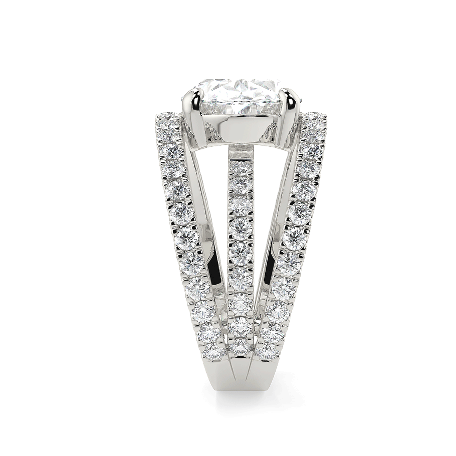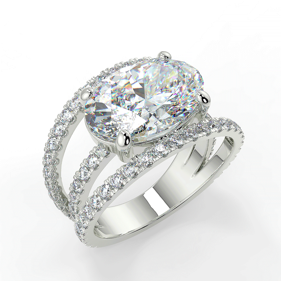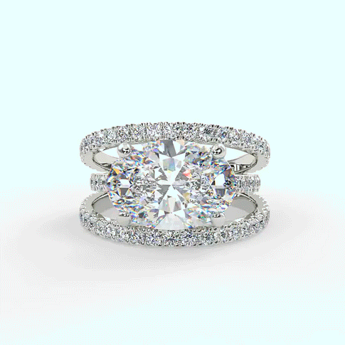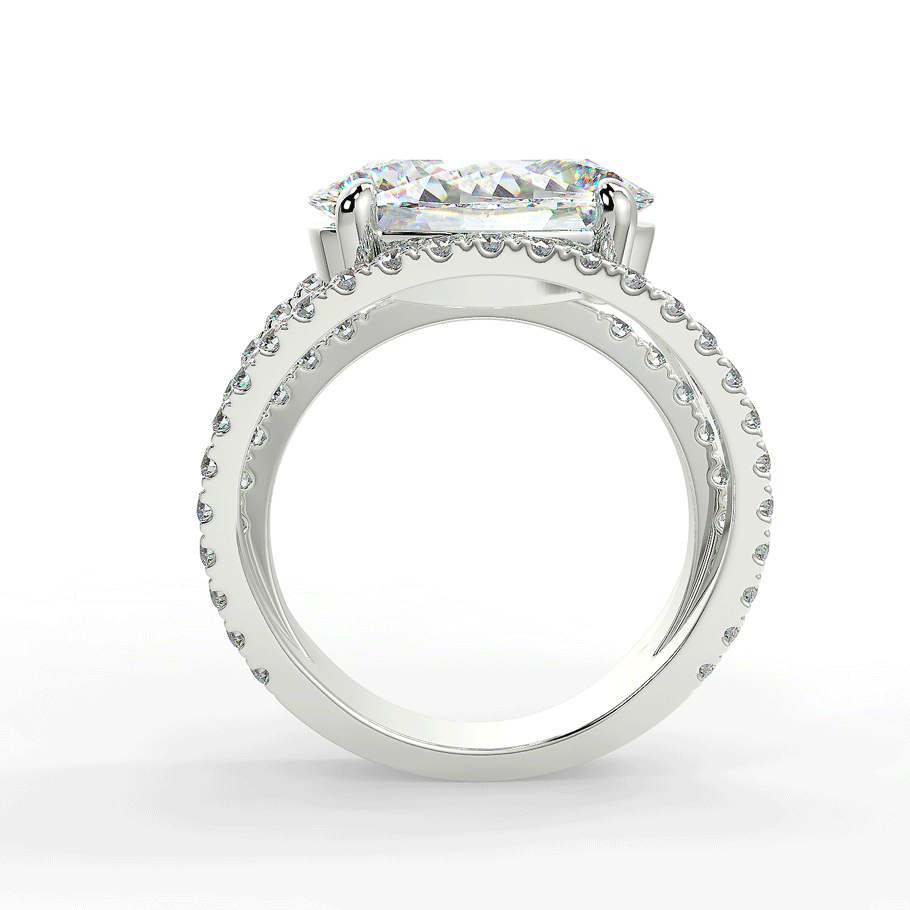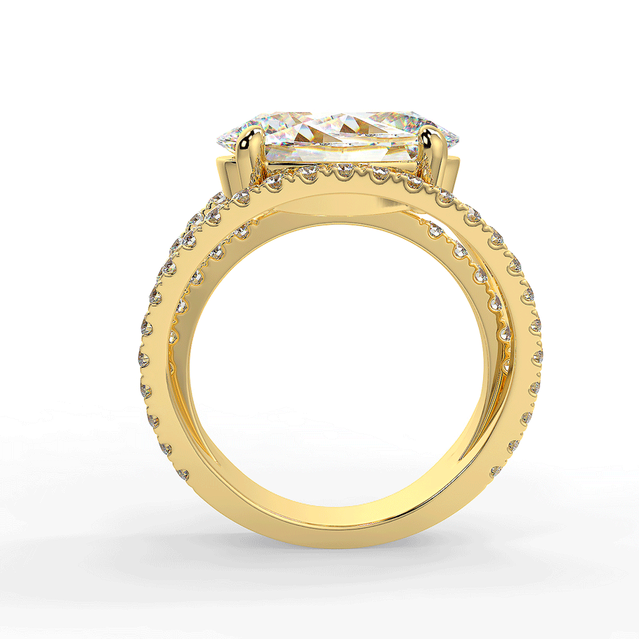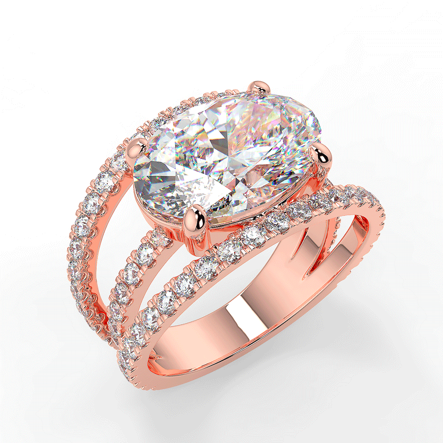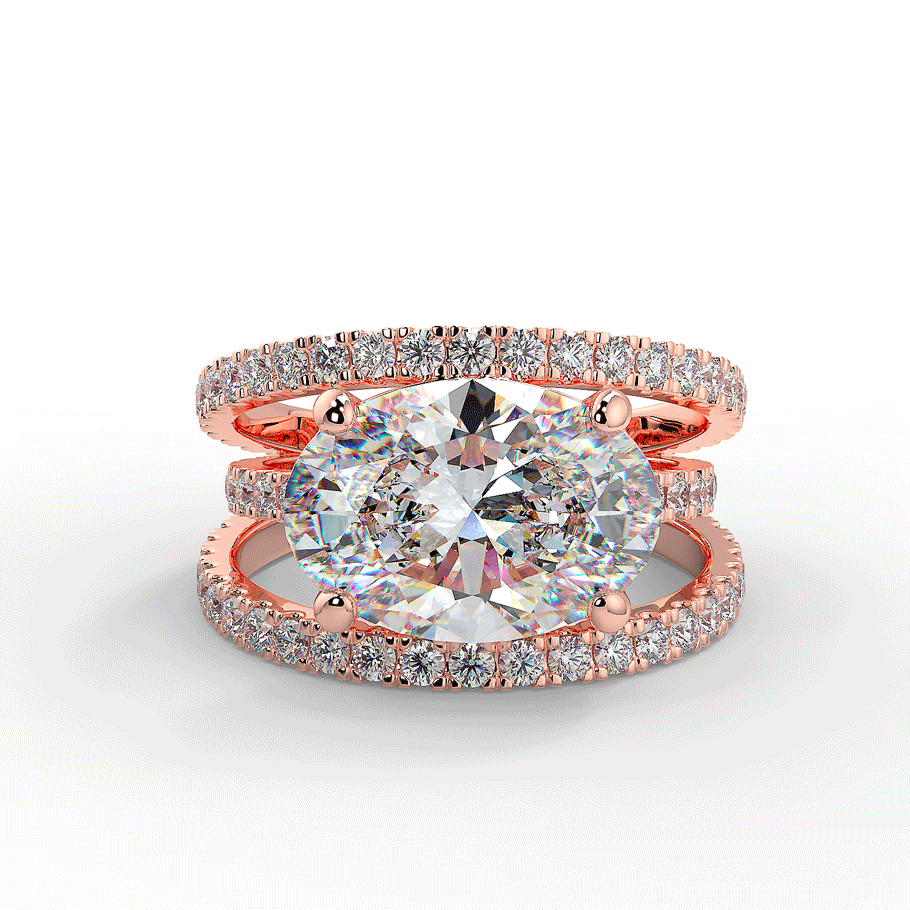 Une bague somptueuse en or 18K ou en platine 950/1000, mettant en valeur un grand diamant de coupe ovale coucher au centre.Ce diamant central, magnifiquement taillé, repose sur une monture moderne à trois anneaux pavés de diamants ronds étincelants, ajoutant une brillance supplémentaire à l’ensemble. La teinte chaleureuse de l’or rose contraste délicatement avec l’éclat pur des pierres précieuses, créant une pièce à la fois audacieuse et élégante. Cette bague luxueuse est parfaite pour ceux qui recherchent un style unique et raffiné.
